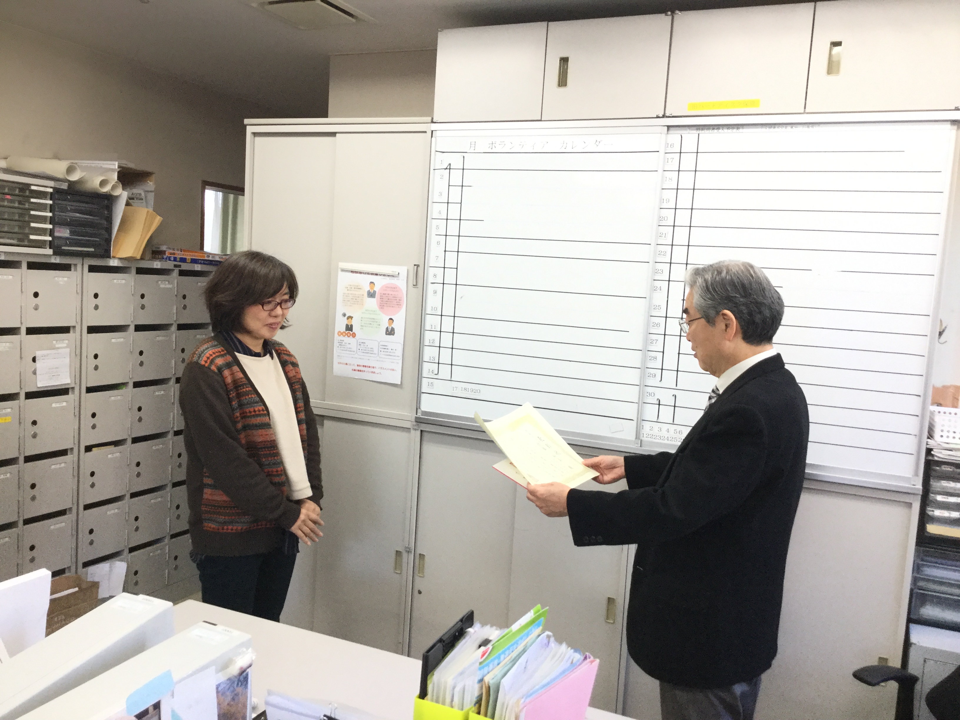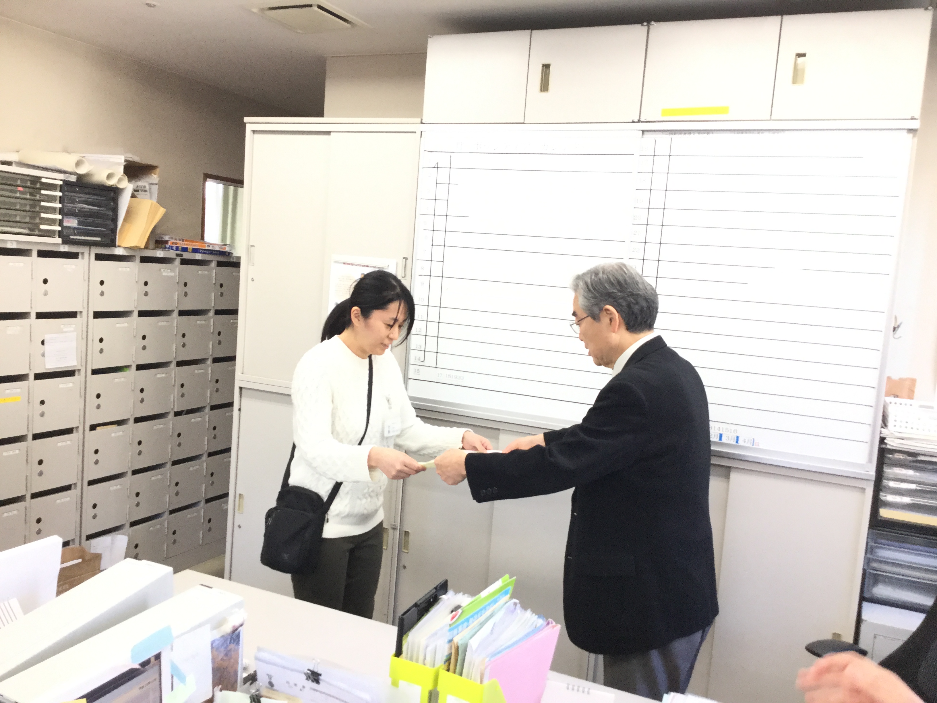 →板垣職員が石川理事長より賞状を受け取っている様子