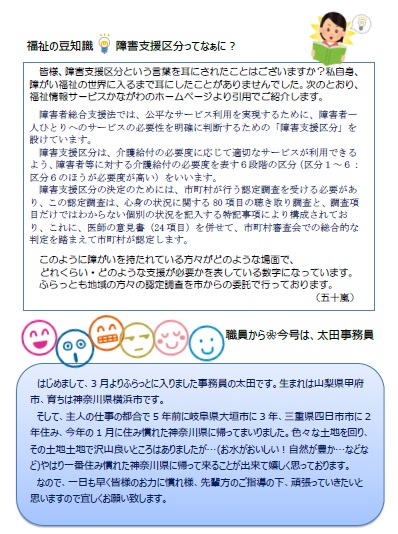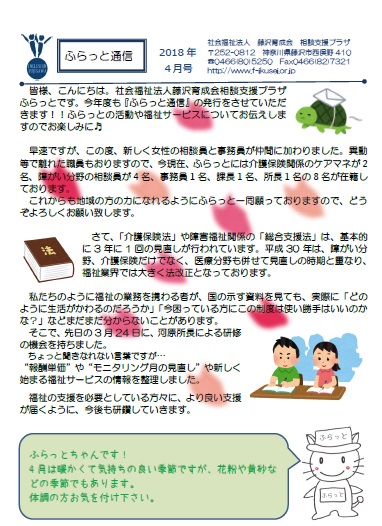 「ふらっと通信」4月号を作成いたしましたので、