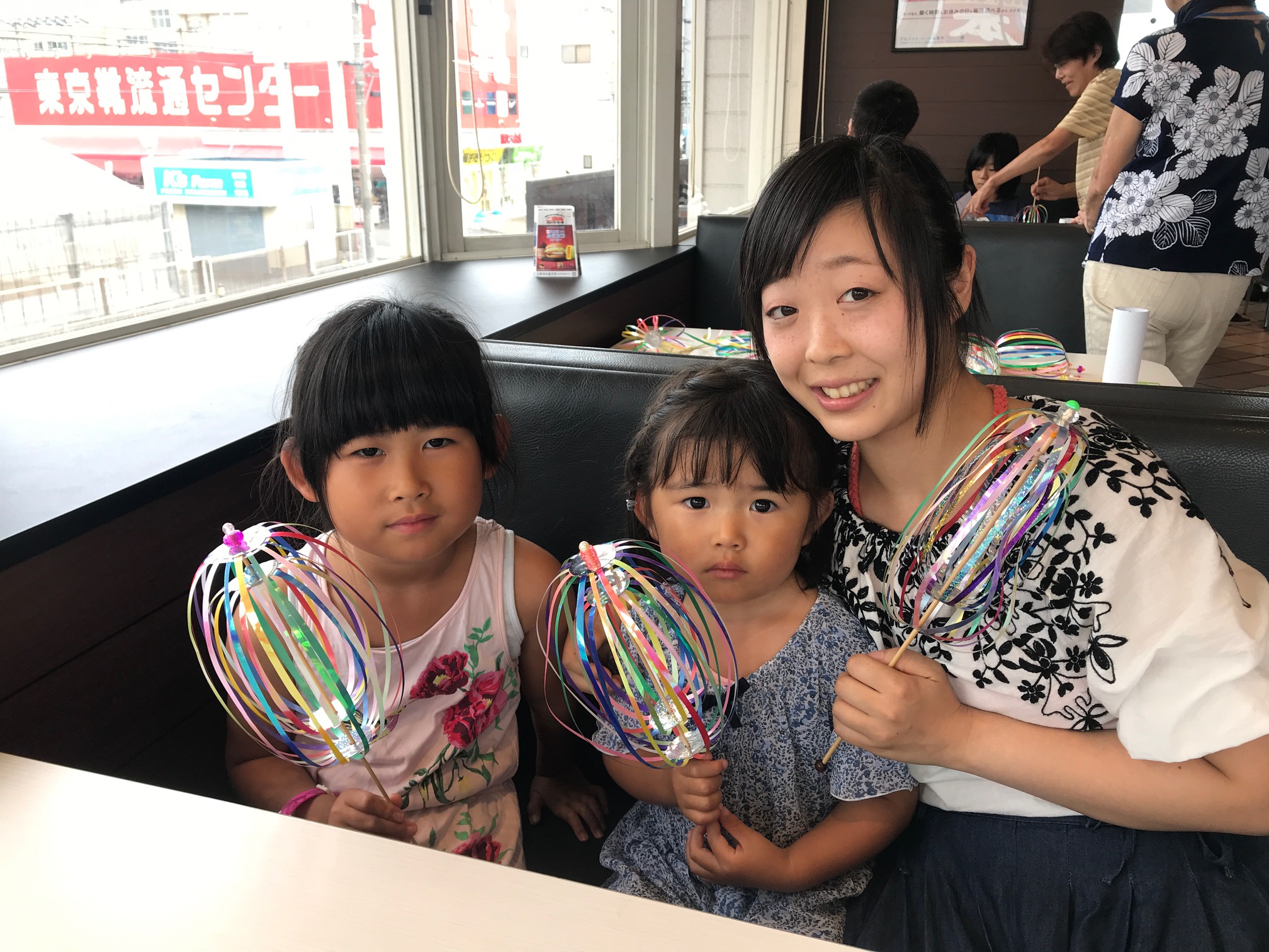 湘南工科大学から6人の学生ボランティアさんが来てくれました。くるくるレインボーを一緒に作ったお子さんと学生さんの記念スナップです。