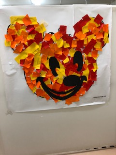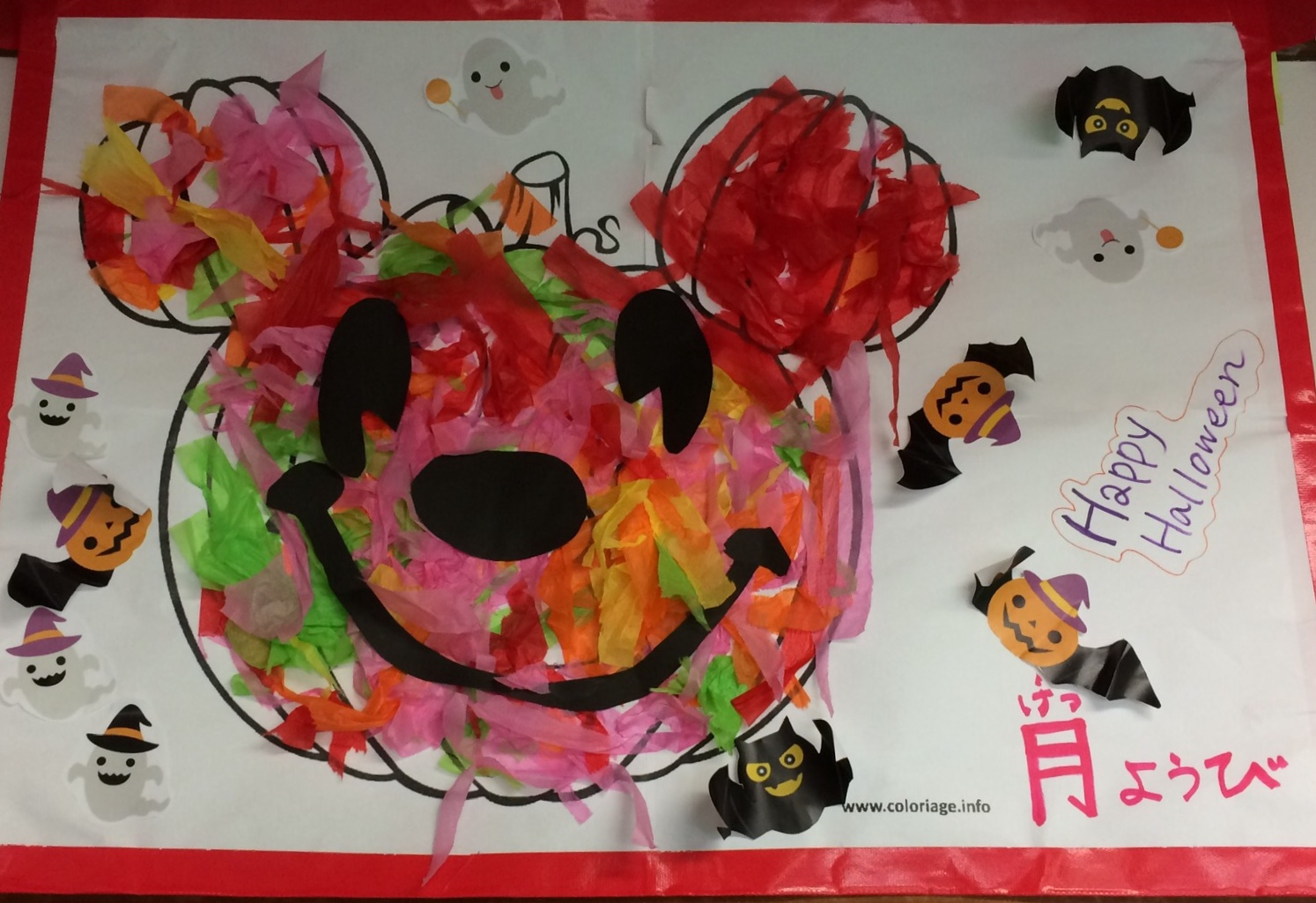 今年は、子どもたちに人気があるミッキーマウスにお花紙や色画用紙をびりびりと破いて大きなかぼちゃの画用紙にペタペタと貼っています♪