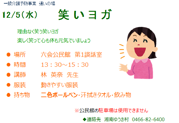 さて、次回の通いの場は12月5日に「笑いヨガ」を開催します。