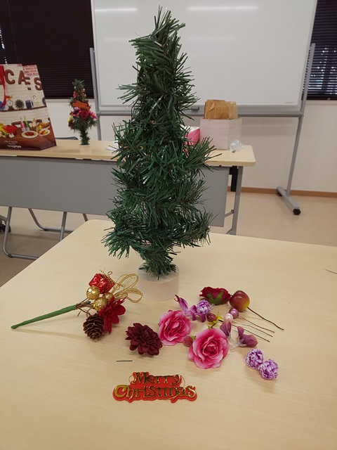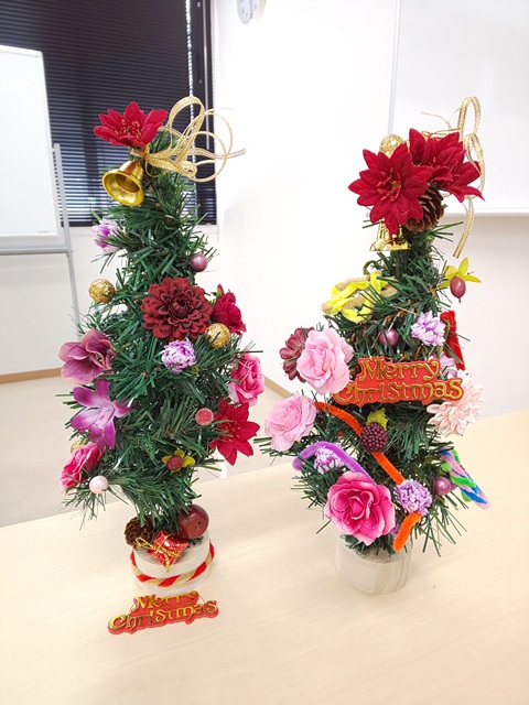 お花がいっぱいついた華やかなクリスマスツリーが完成しました。