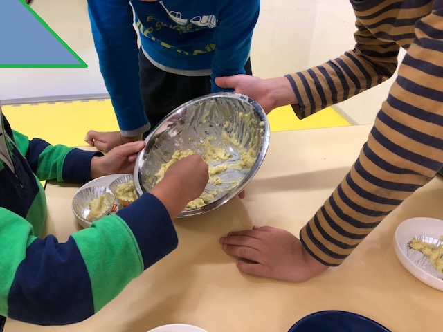 おやつ作りを通して、説明を聴く・お友達との協力やお互いに相談するというねらいでプログラムを行ないました。