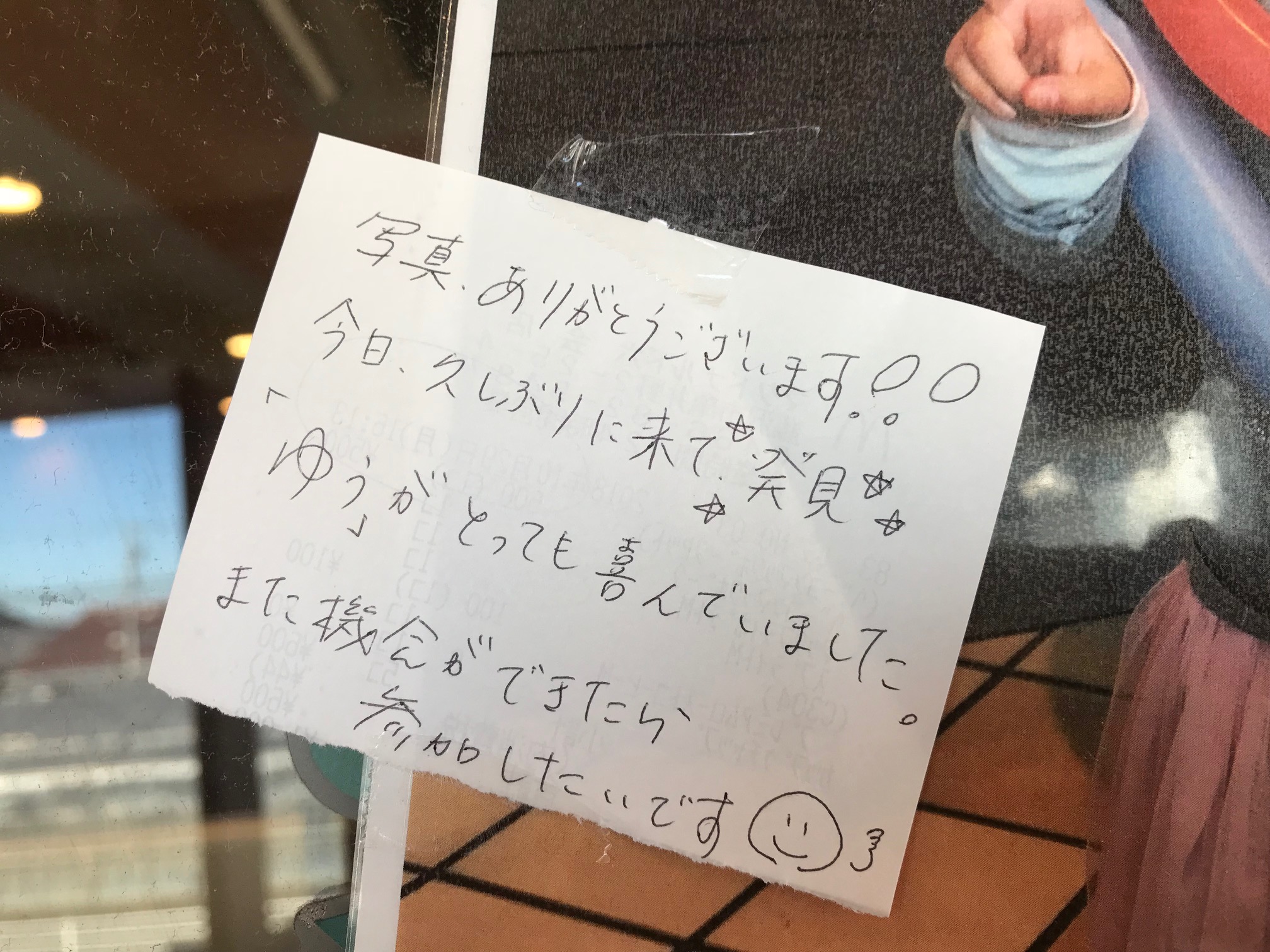 久しぶりに来られて、ご自分の写真を見つけて、わざわざお礼のメモを残してくれていたのです。お礼を言われるどころか、こちらの方がこのメモを見て大感激しました。