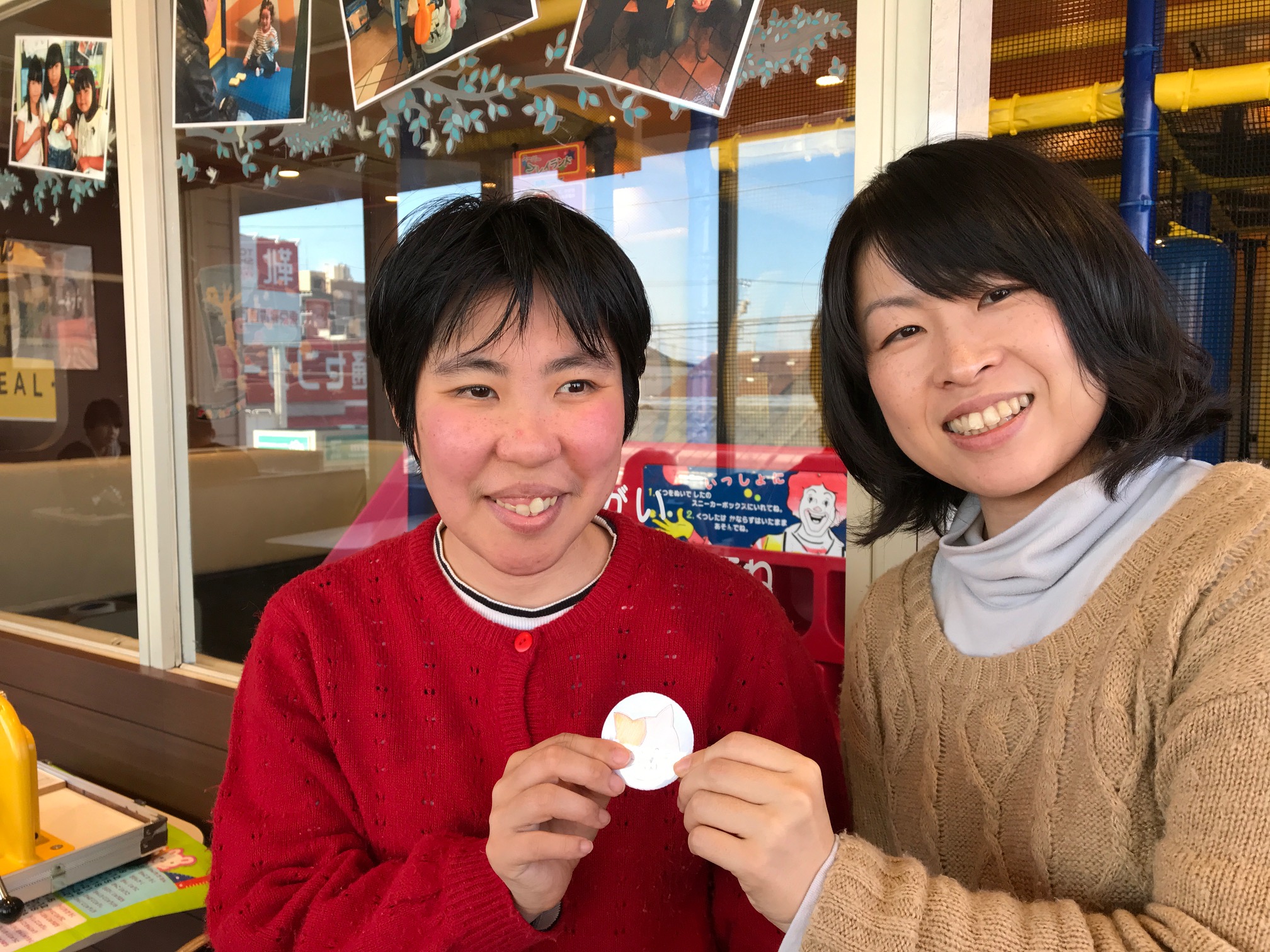 佐藤さんは、山本ちはるさんデザインのぬり絵に挑戦、かわいい絵が完成しました。その絵をみんな・de・六会の常連のIさんが機械をすべて操作して、きれいな缶バッチに仕上げてくれました。Iさんはご自分でいつも缶バッチを作っているので、機械の操作はお手の物、バッチの上下の向きの微調整を細かくして見事に仕上げてくれました。