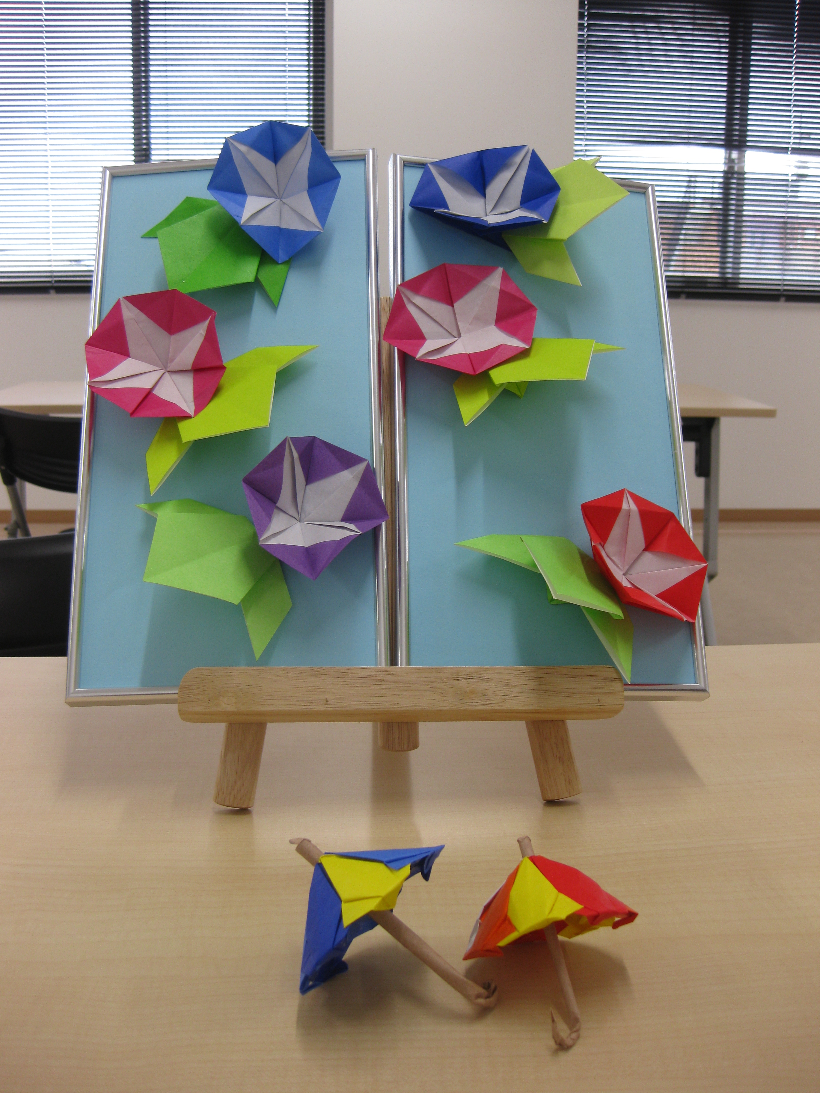 季節に合わせて朝顔の壁掛けと傘を作りました。