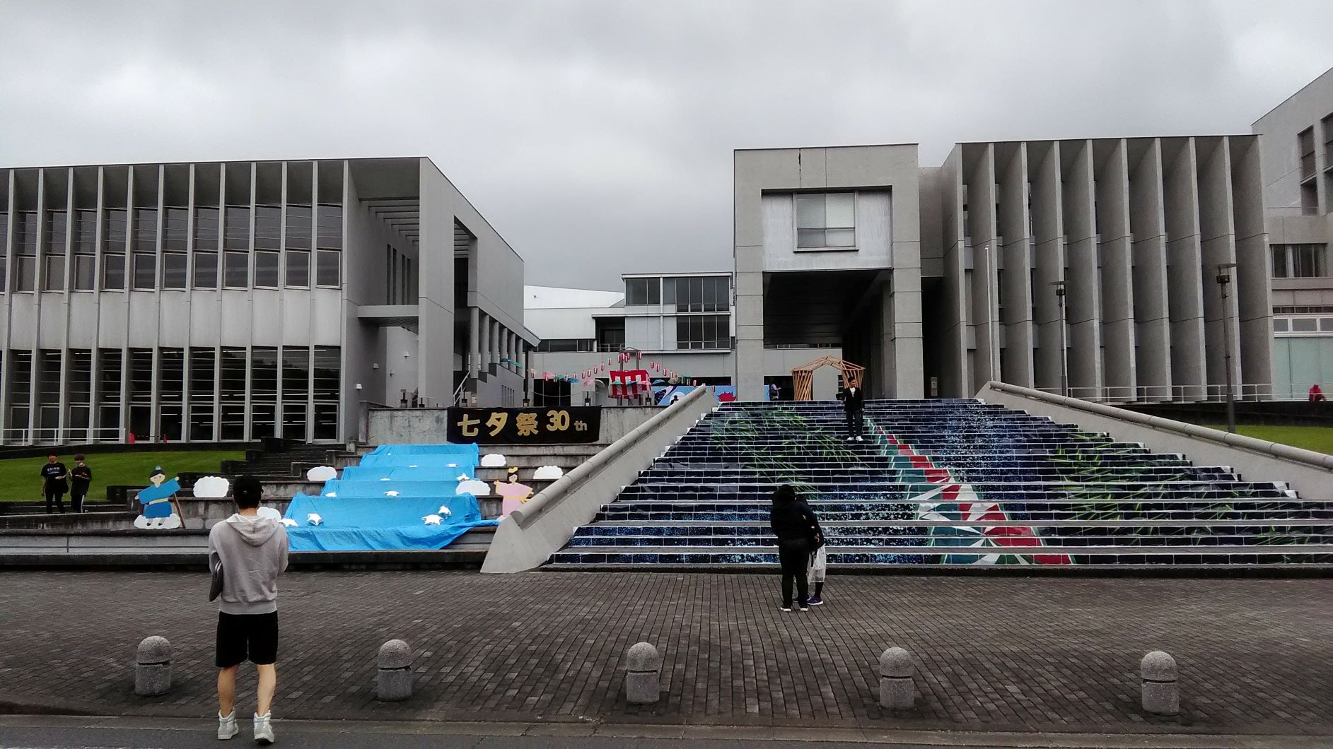 ↓キャンパス入り口。そらは曇天ですが、学生さんの熱気が、雨を跳ね返したのか、祭りの間は降りませんでした。夜の花火も無事実施され、祭りが終わった直後に、雨が降ってきました。