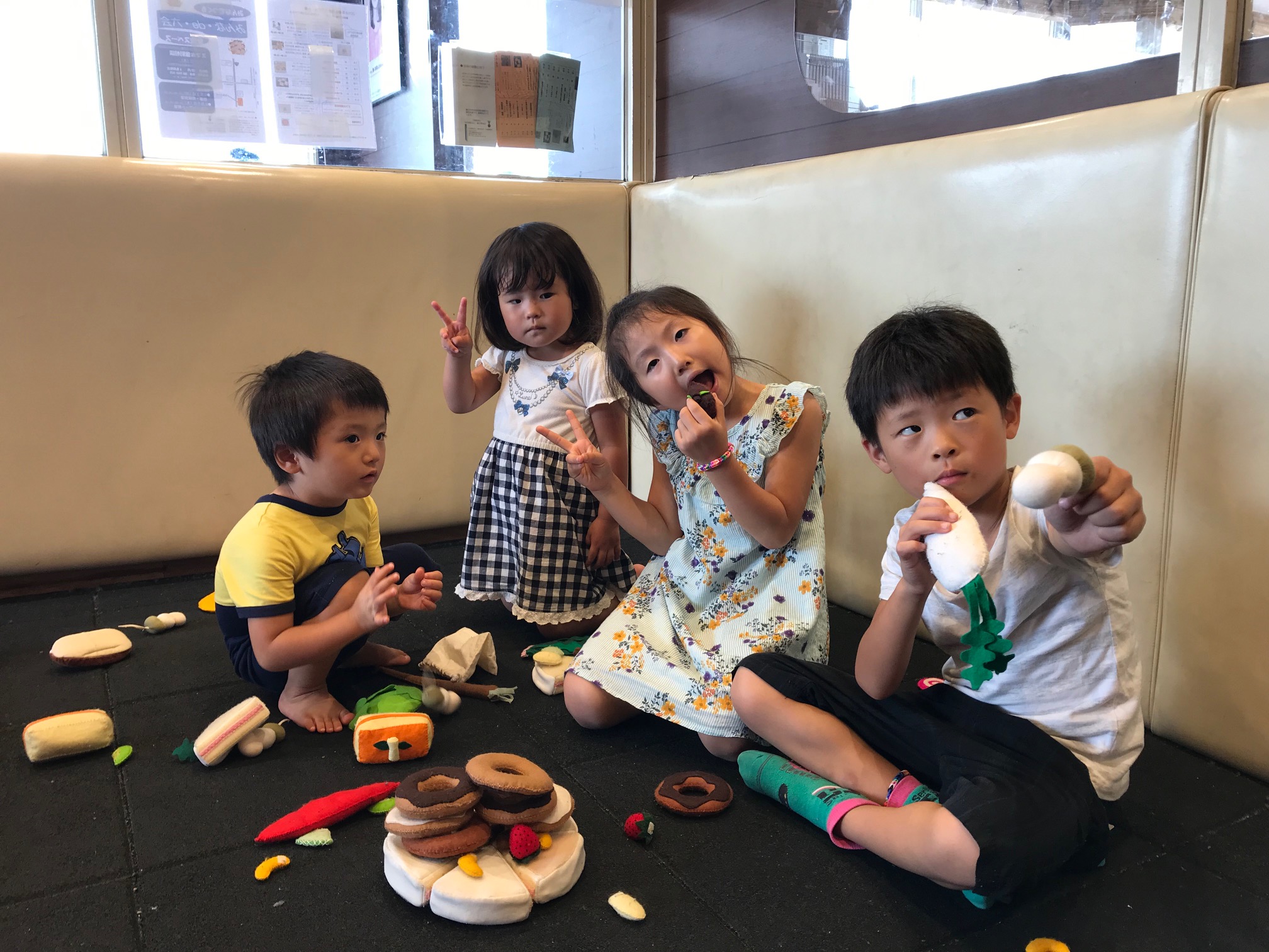 夏休みなので8月は毎回、お子さんたちで一杯です。座席の横にある、50㎡ほどのキッズスペースは特に人気で、自由に遊び回るちびっ子たちの嬌声がいつも鳴り響いています。この日は「布おもちゃで遊ぼう」のプログラムでした。キッズスペースにパン屋さんや八百屋さんの布おもちゃを並べて、みんなでお店屋さんごっこ。「いらっしゃいませ、いらっしゃいませ」の声が元気に行き交っていました。