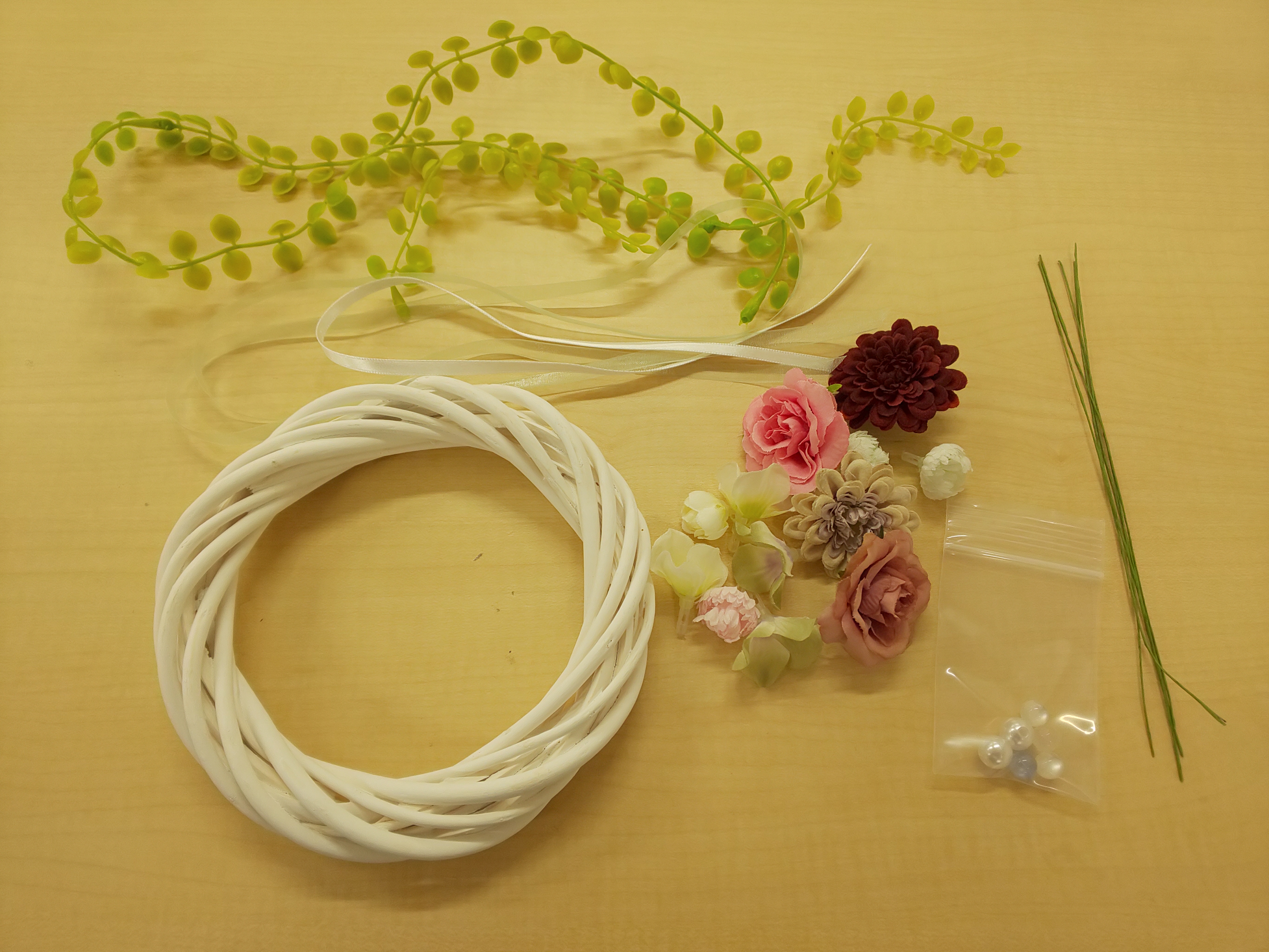 ワイヤーを使って、リボンに通したお花とツル状のグリーンをリースに固定していきます。