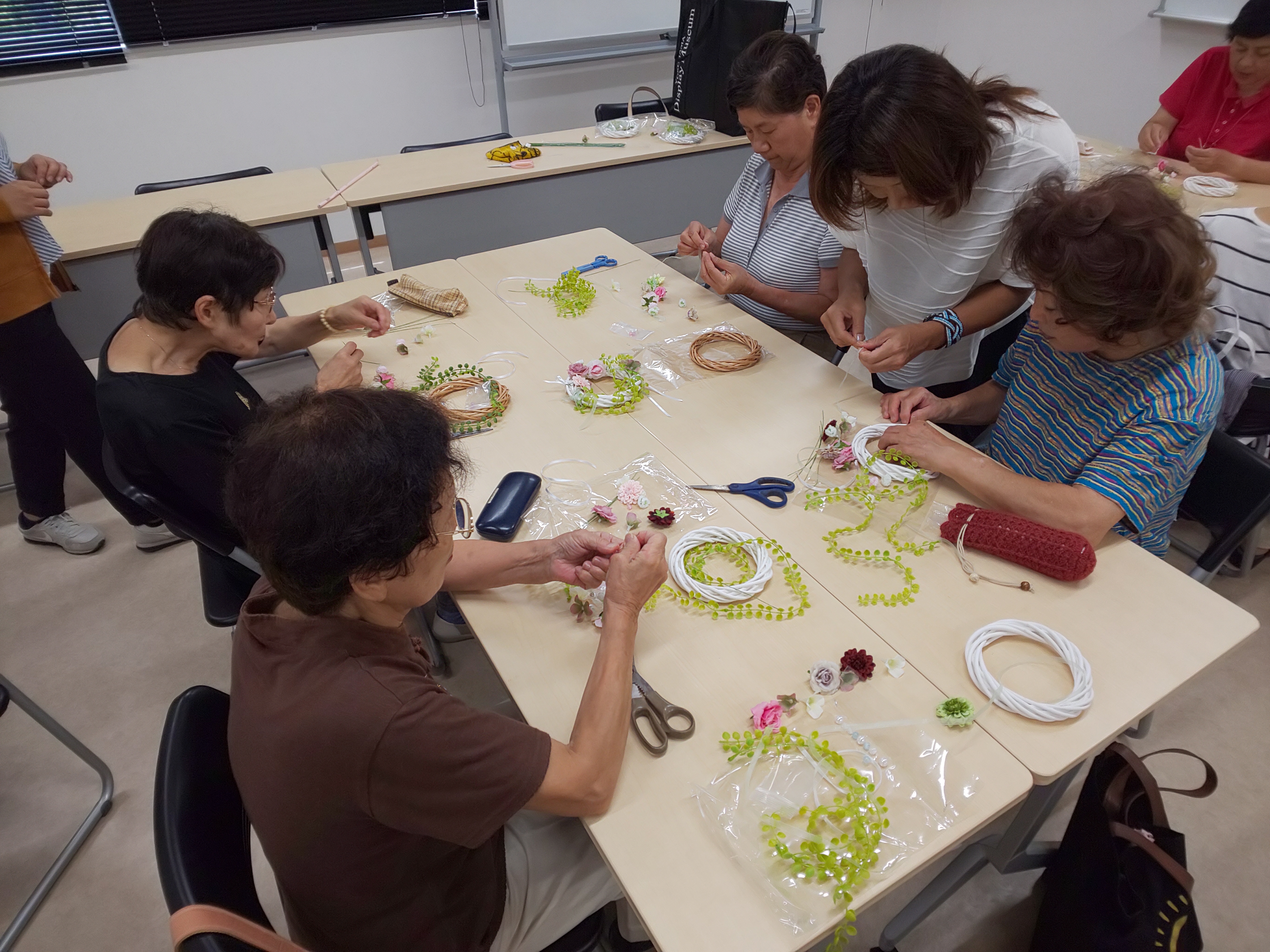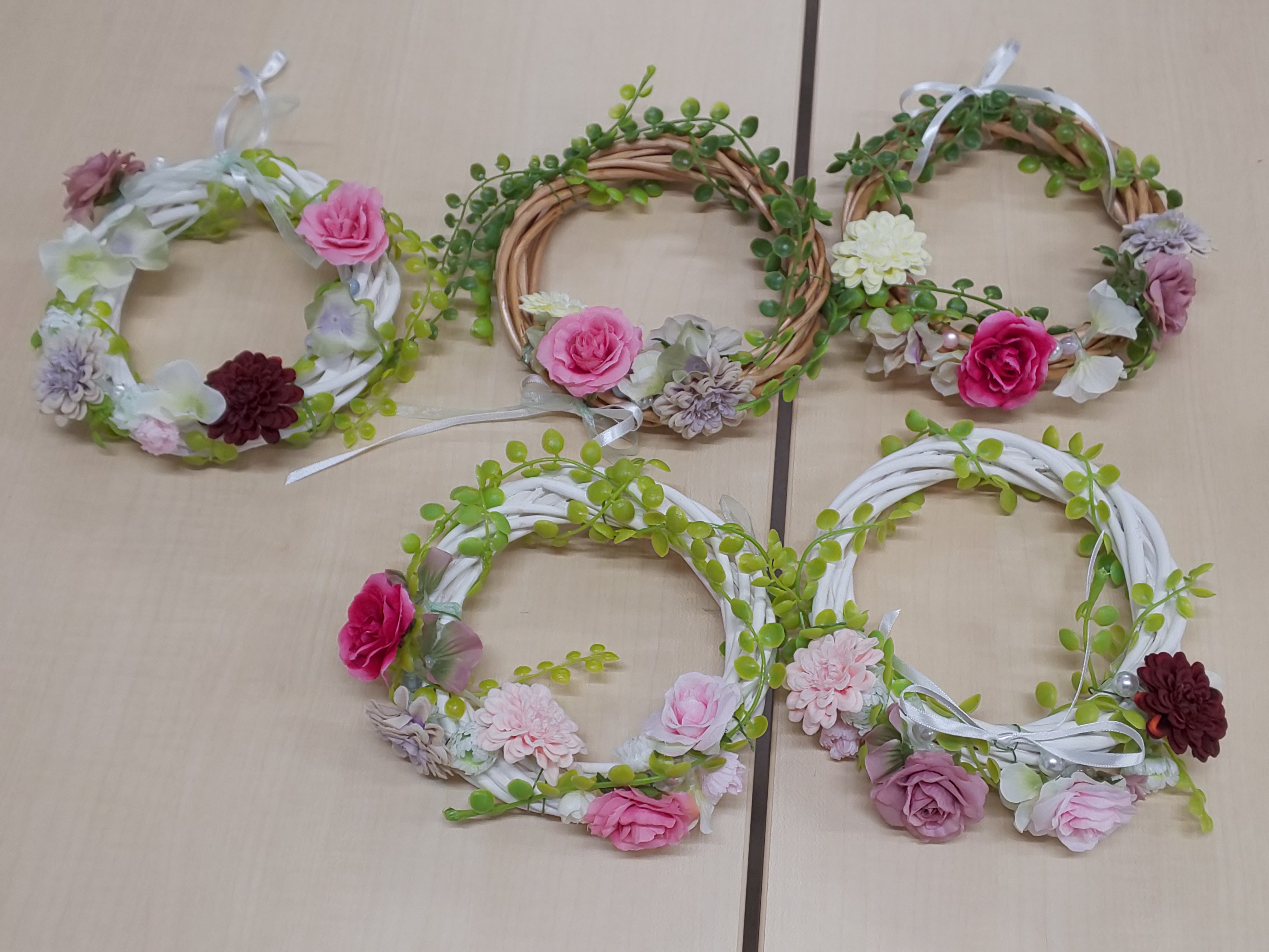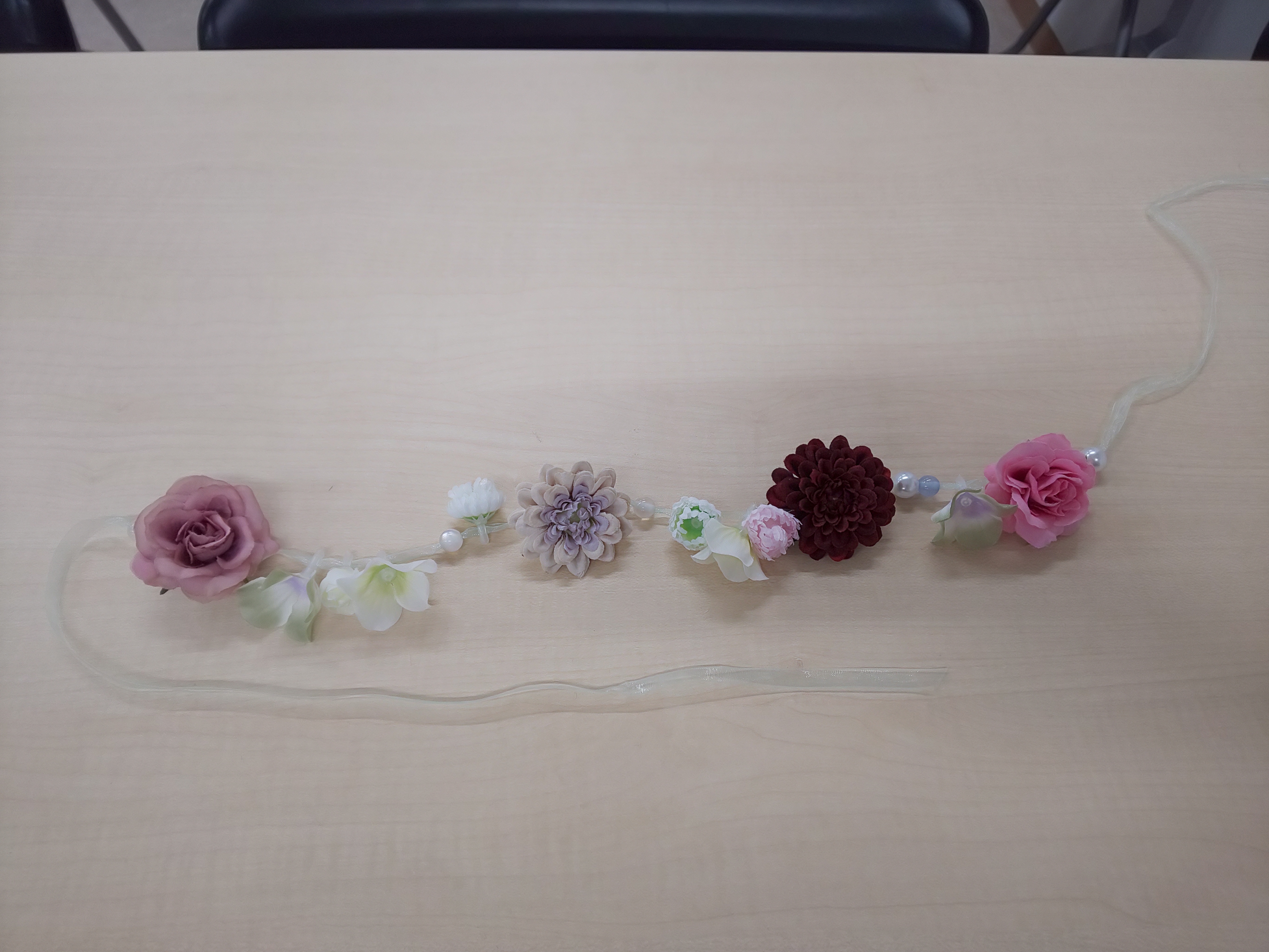 いつものアートフラワーとは違い、ワイヤーとテープを使うのではなく、今回はリボンにお花やビーズを通していきます。