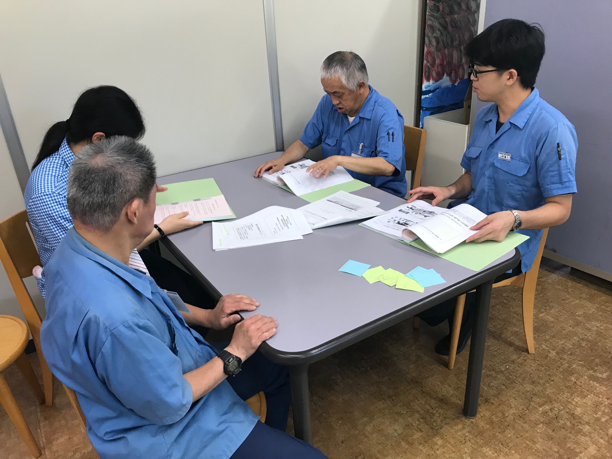 資料のファイリング作業を行うにあたって、みらい社2Fの食堂奥で、8人ぐらいの社員と資料を順番通りに取る人、資料の順番等を検品する人、資料に穴あけパンチする人、ファイリングする人に分かれて作業を行っています。
