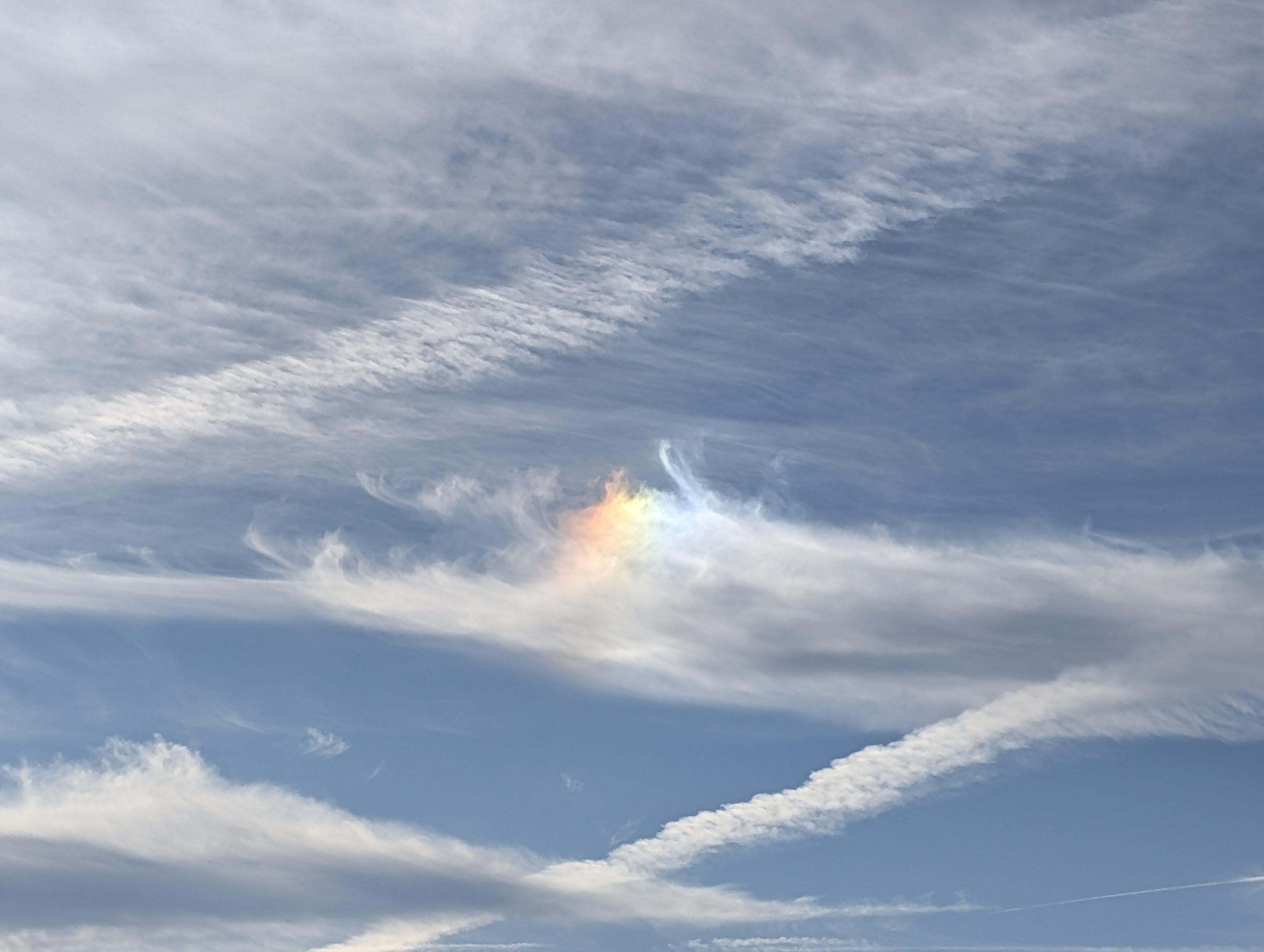 太陽の横に現れる虹色に輝く光の現象で、空気中の氷の粒によって太陽光が屈折することで現れる現象のようだ。特に、太陽の高度が低い朝焼けや夕焼け時に見られることが多く、私が見たのも夕方18時頃だった。