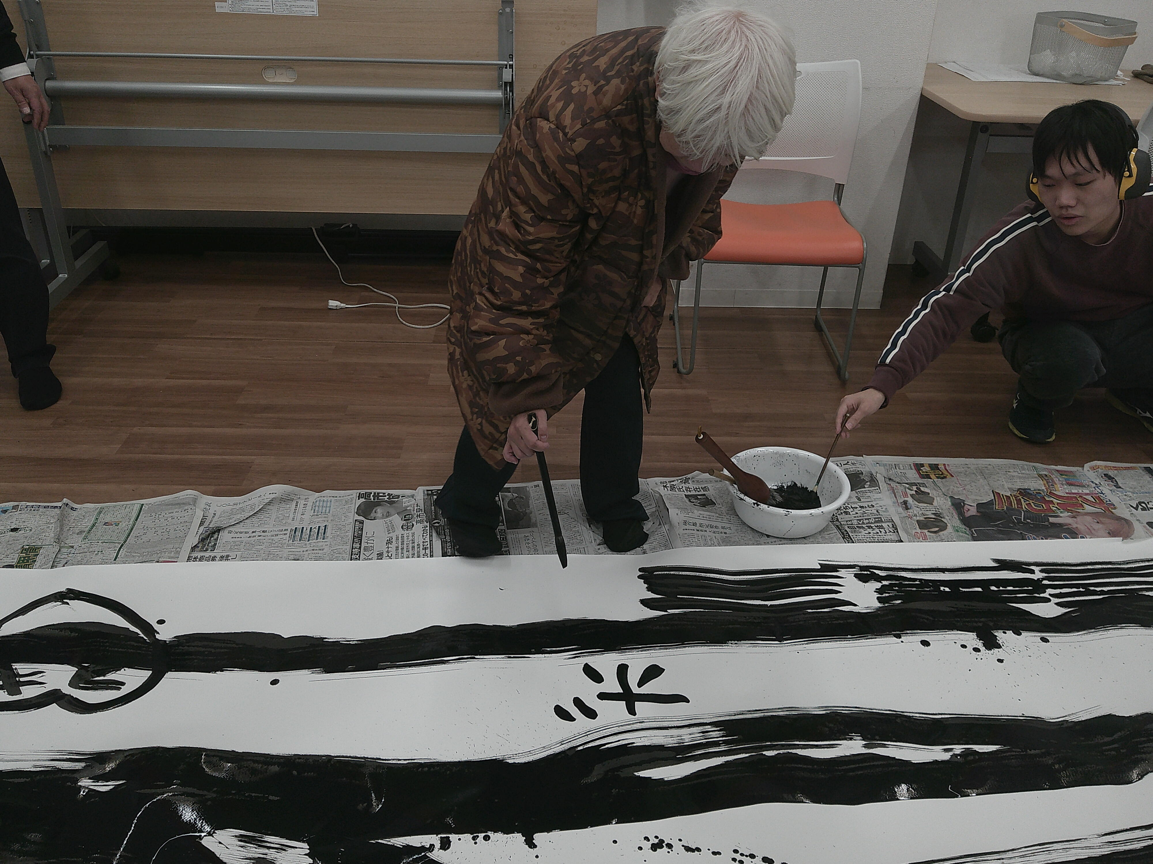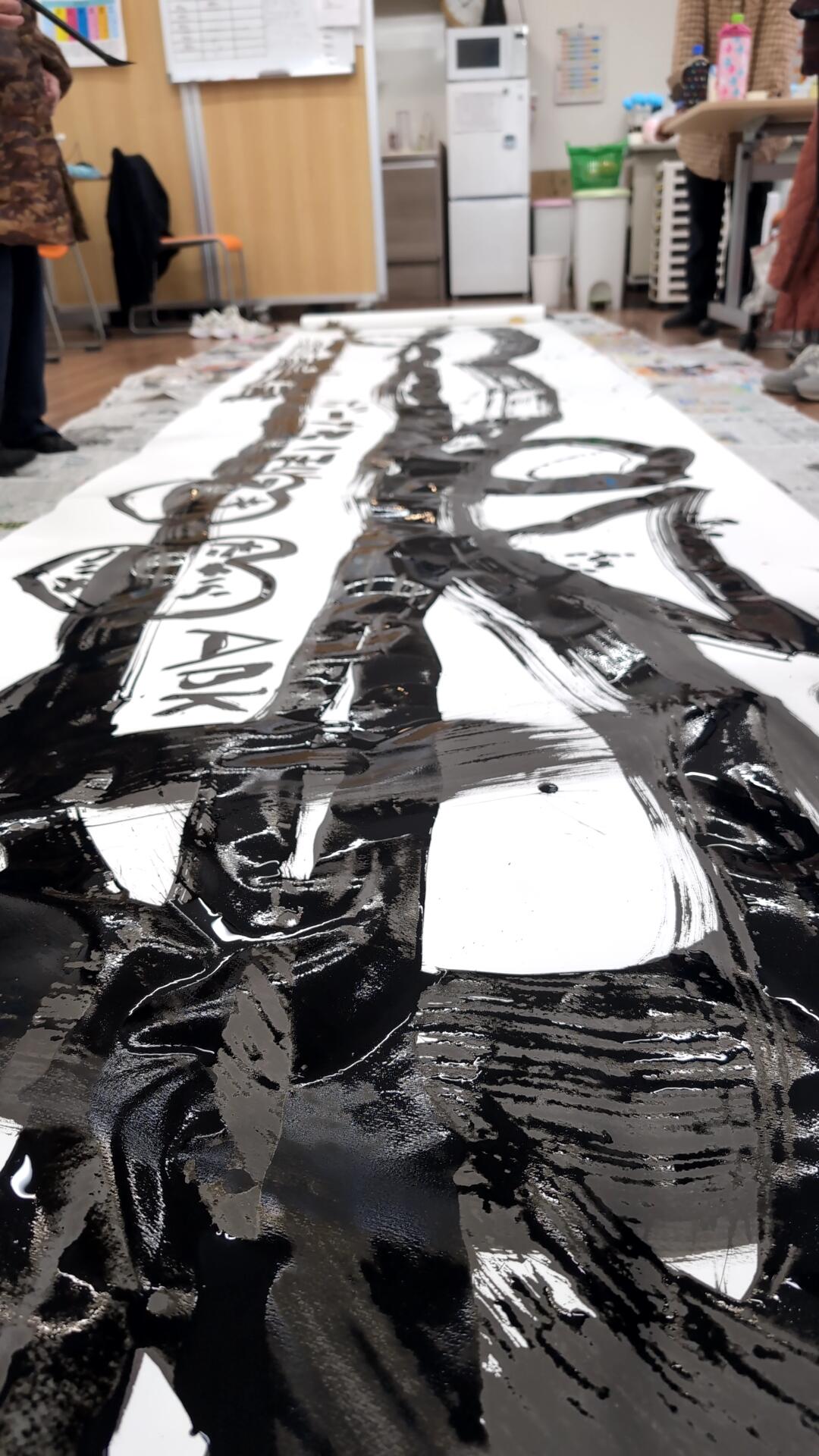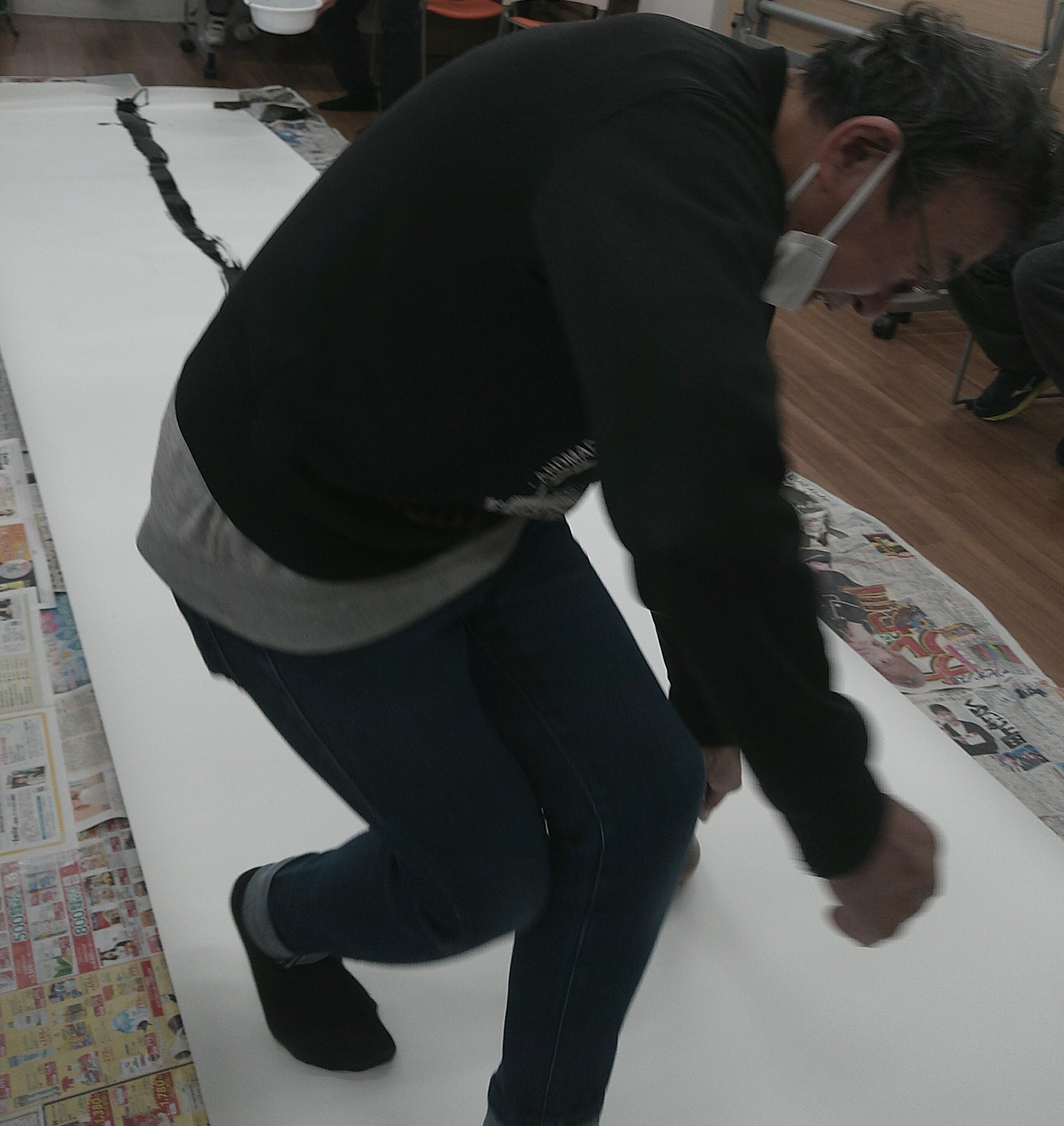 特大の筆で5mの長い紙に線を描いて遊びました。
