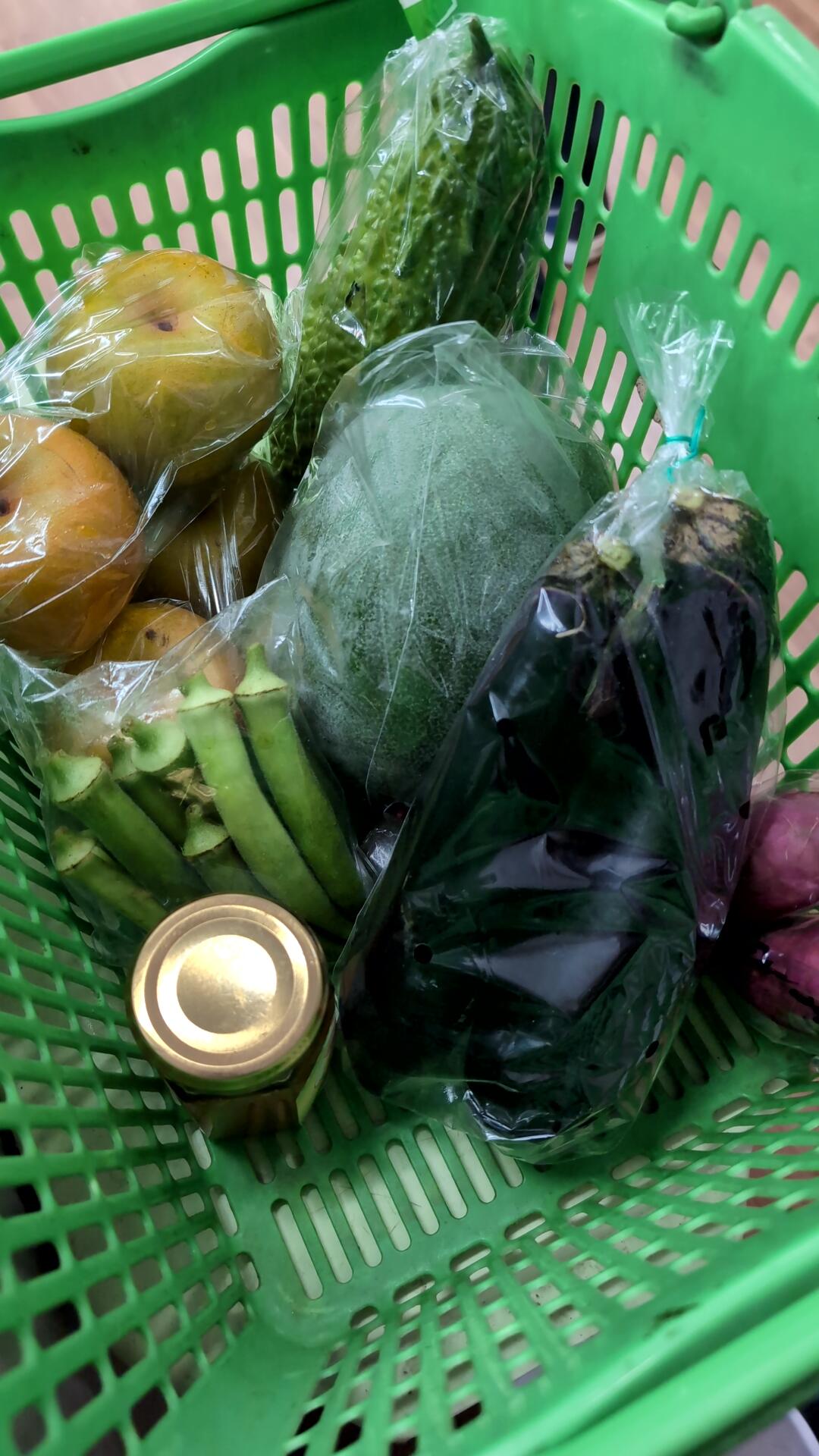 今日入れるのは、ゴーヤ、オクラ、茄子、冬瓜、さつま芋、梨です。