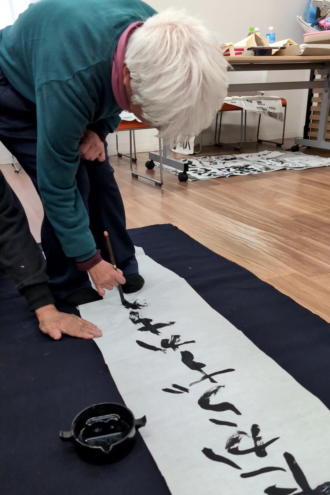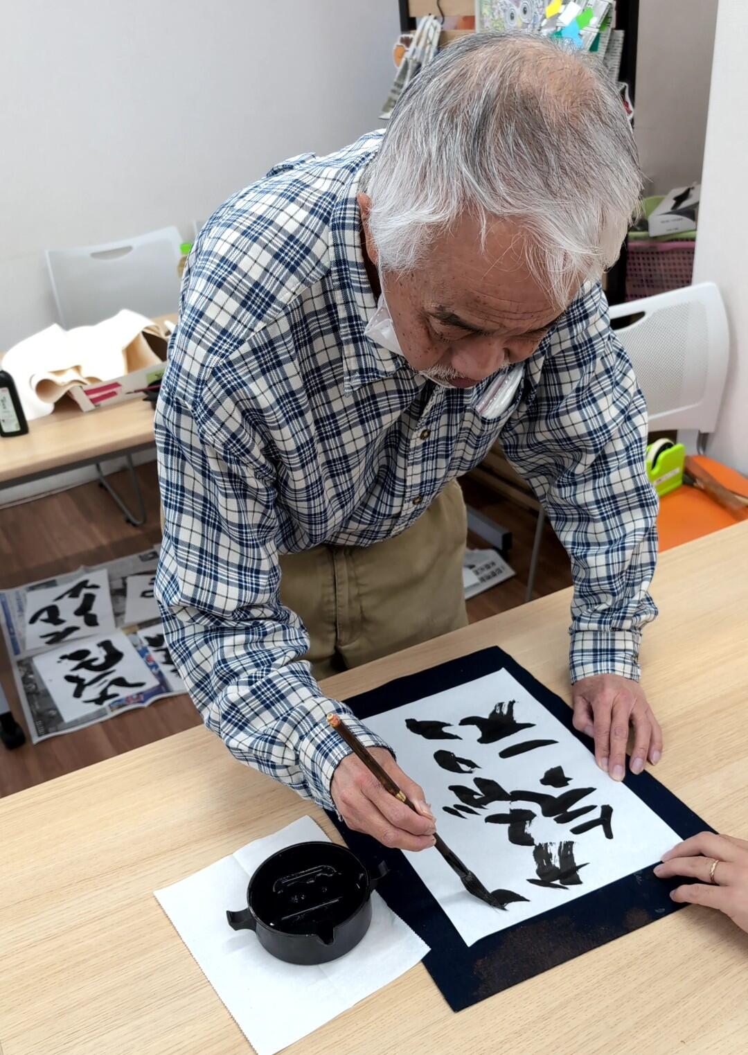 筆で書いている姿は書家のようで、書きぶりは自由でなんとも見事でした!