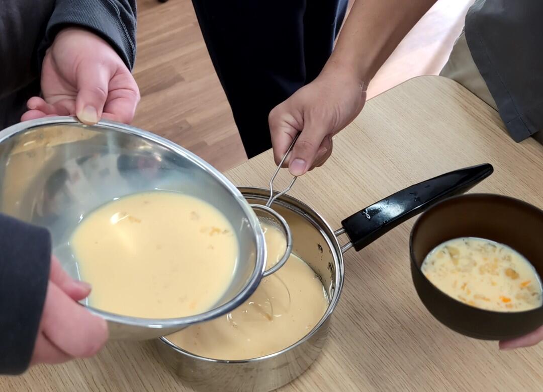 ①生地作り:卵、牛乳、バニラエッセンスを混ぜ合わせ漉す