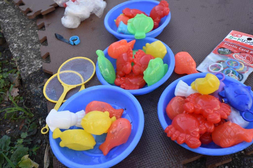 水鉄砲や金魚すくいのおもちゃなどで水遊びをしたり